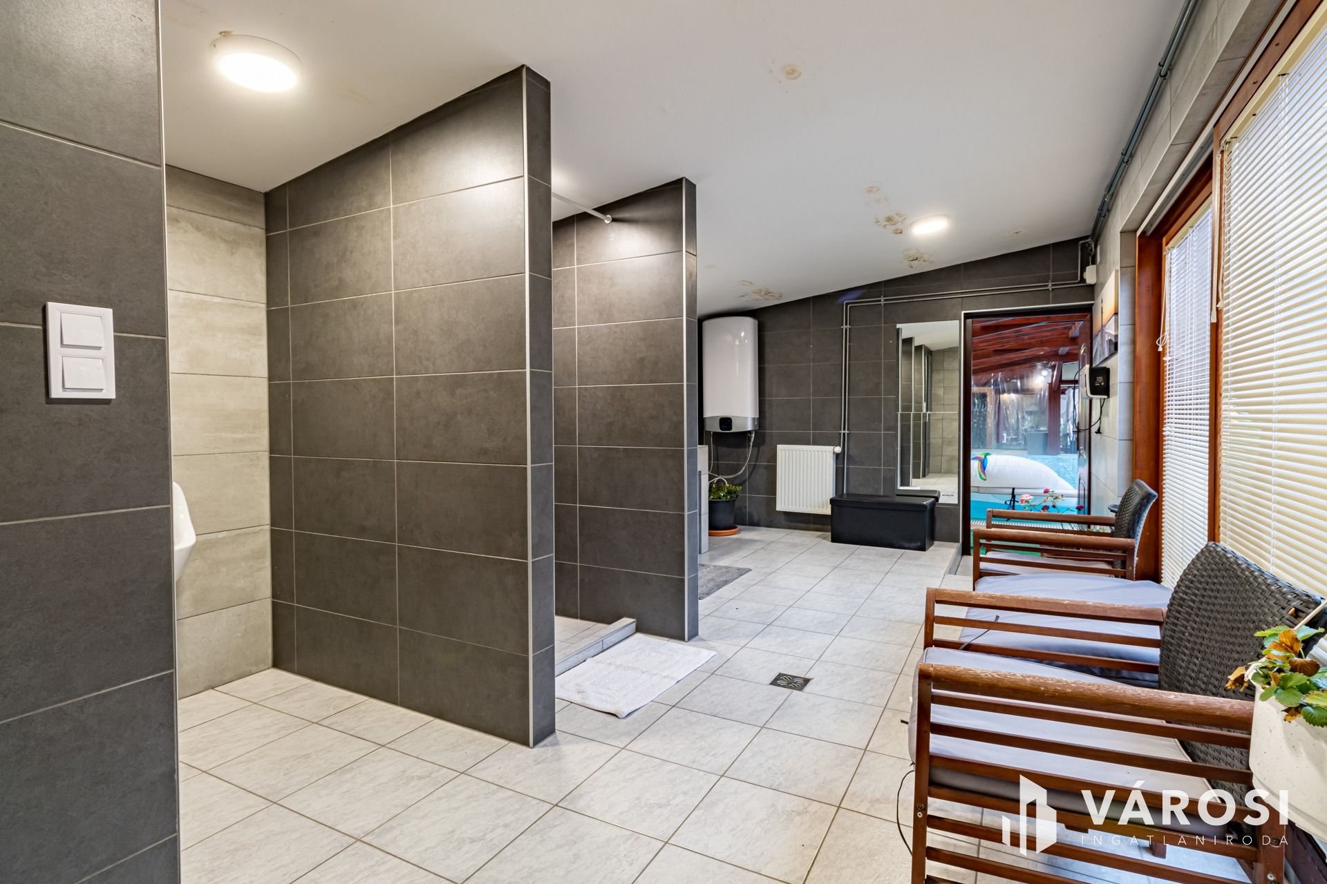 Behind the pool, you'll find a separate bathroom and changing area, complete with plumbing for a washing machine.