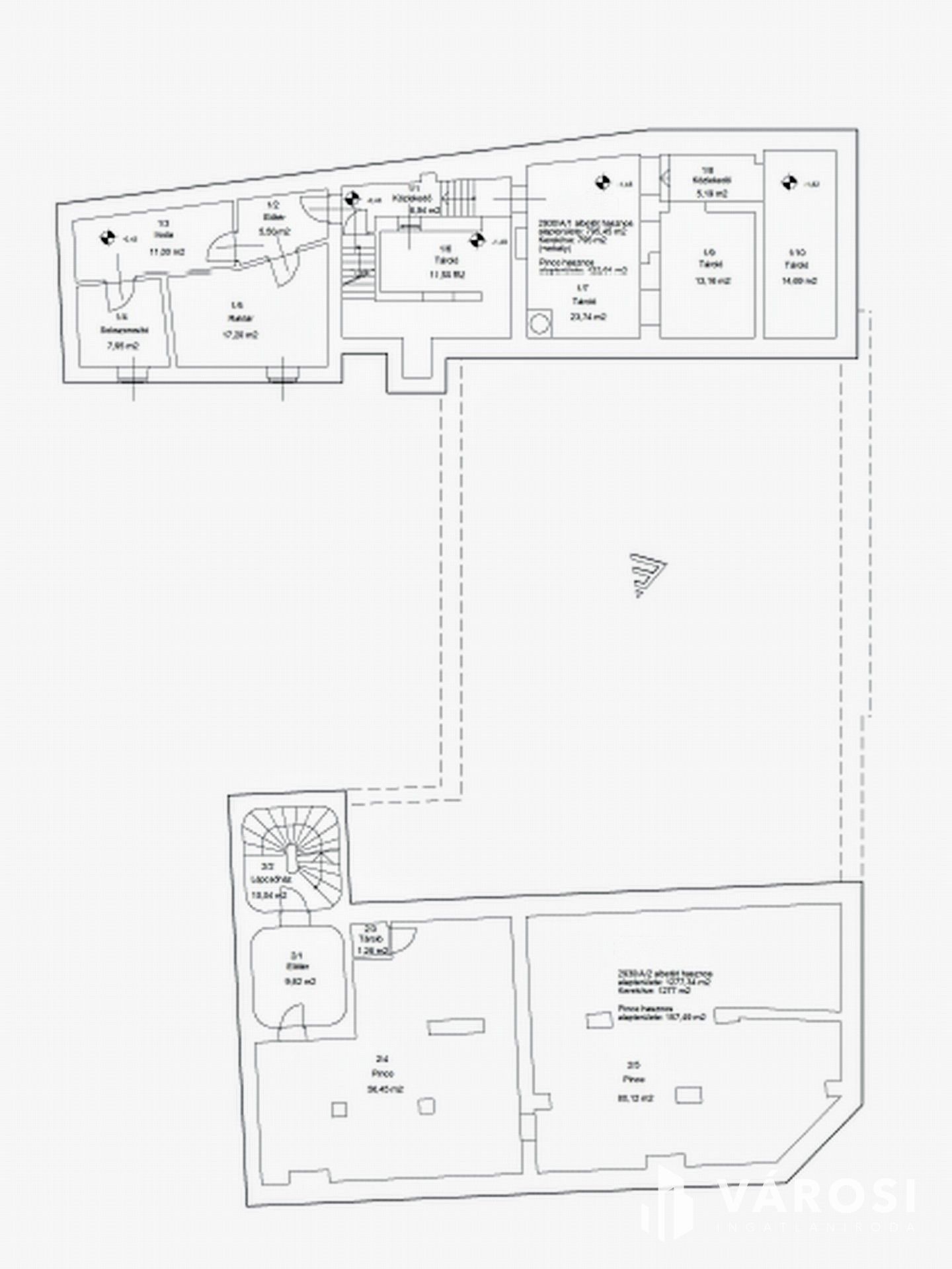 Társasházi alapító okirattal, 2 HRSZ-szel rendelkezik, a tulajdoni lapon irodaépületként szerepel.
