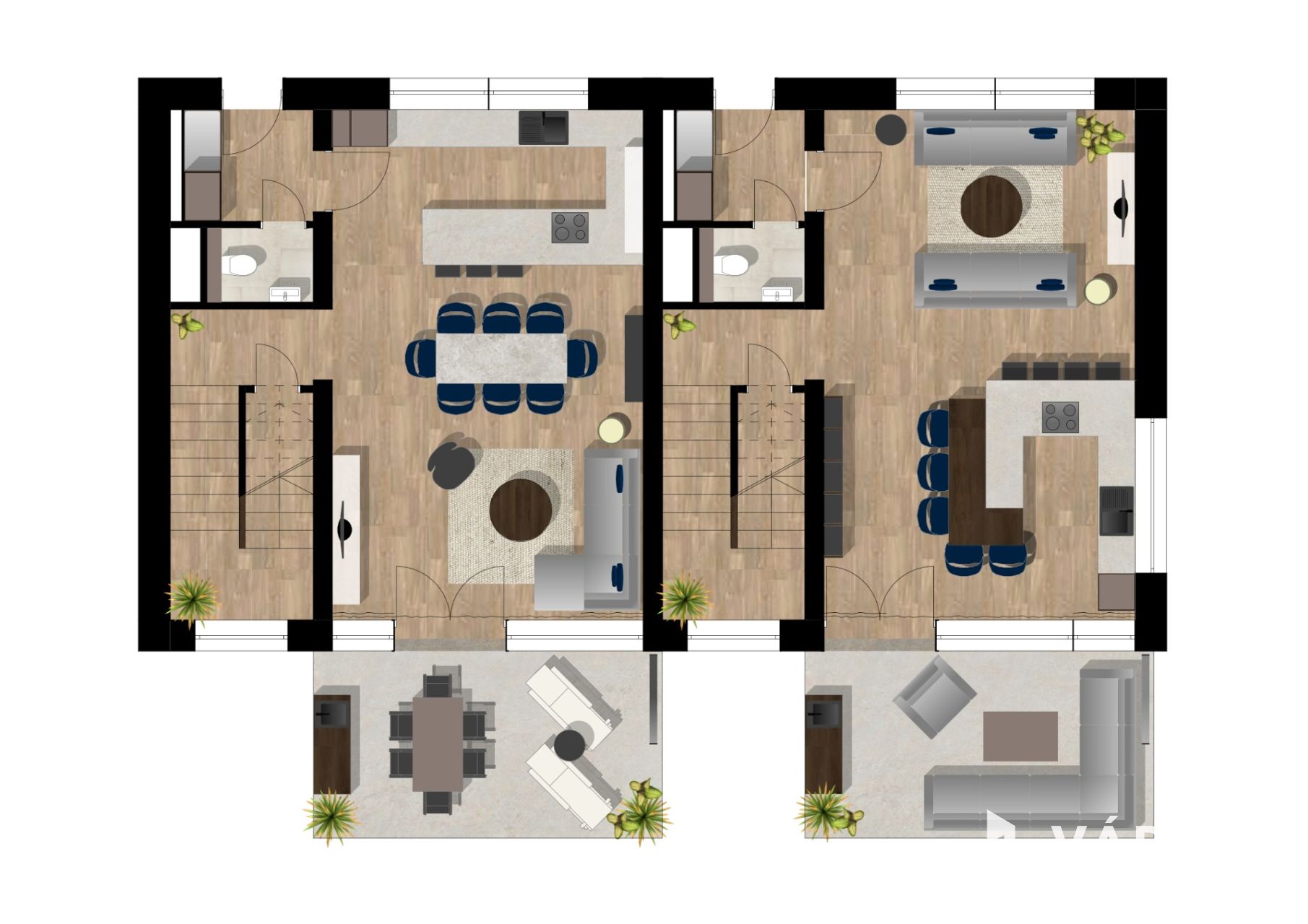A nappaliból nyíló 17,5nm-es terasz mellett egy 86nm-es saját kertrész biztosítja a nyugodt pihenést, amely családi, baráti összejövetelek, esti borozgatások, grill partyk méltó színhelye lehet.