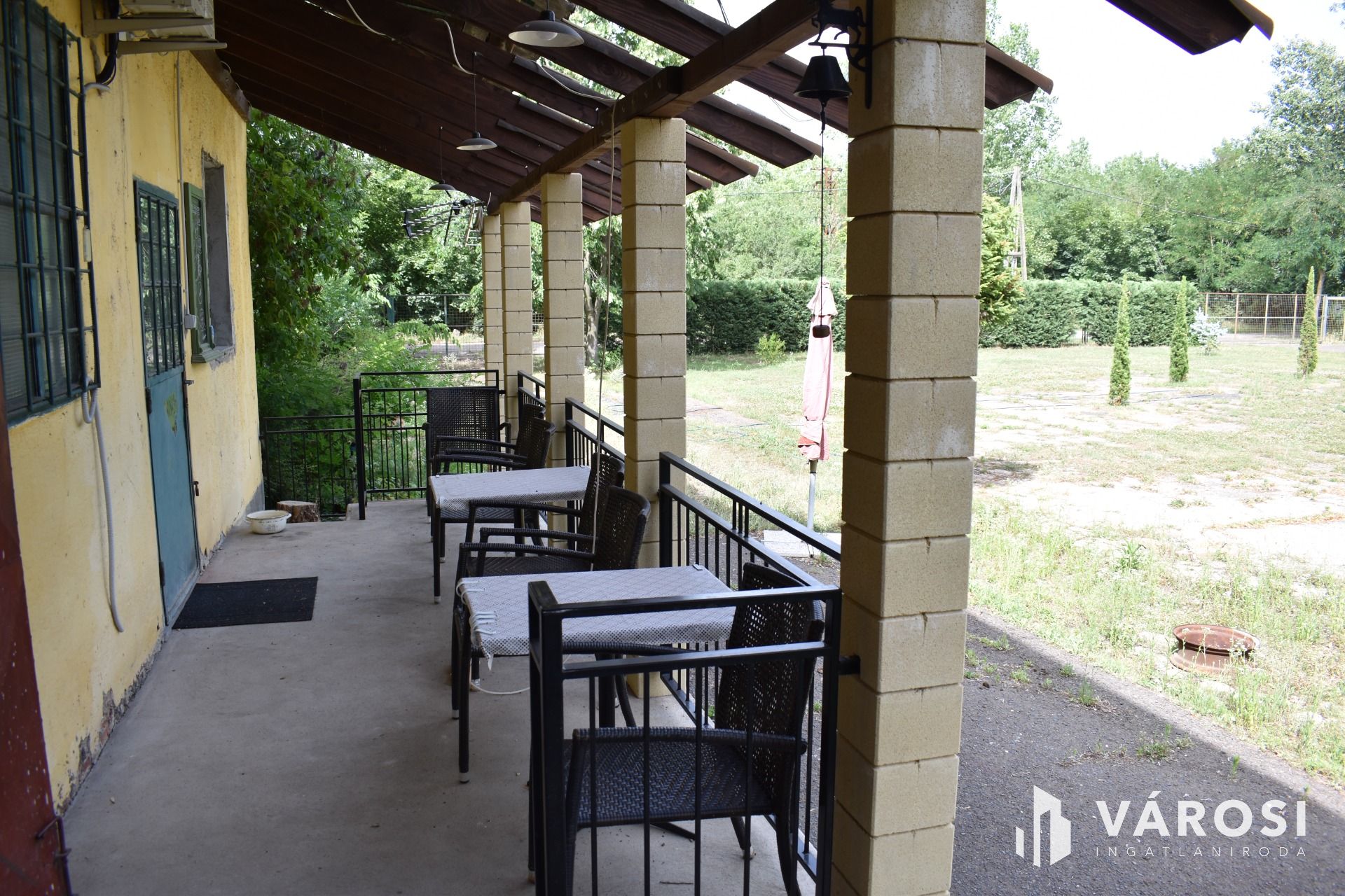 Néhai rakodó-rámpa, a hozzá tartozó tetővel átépítésre került, így hangulatos fedett terasszá vált (tűzifa tárolóval).