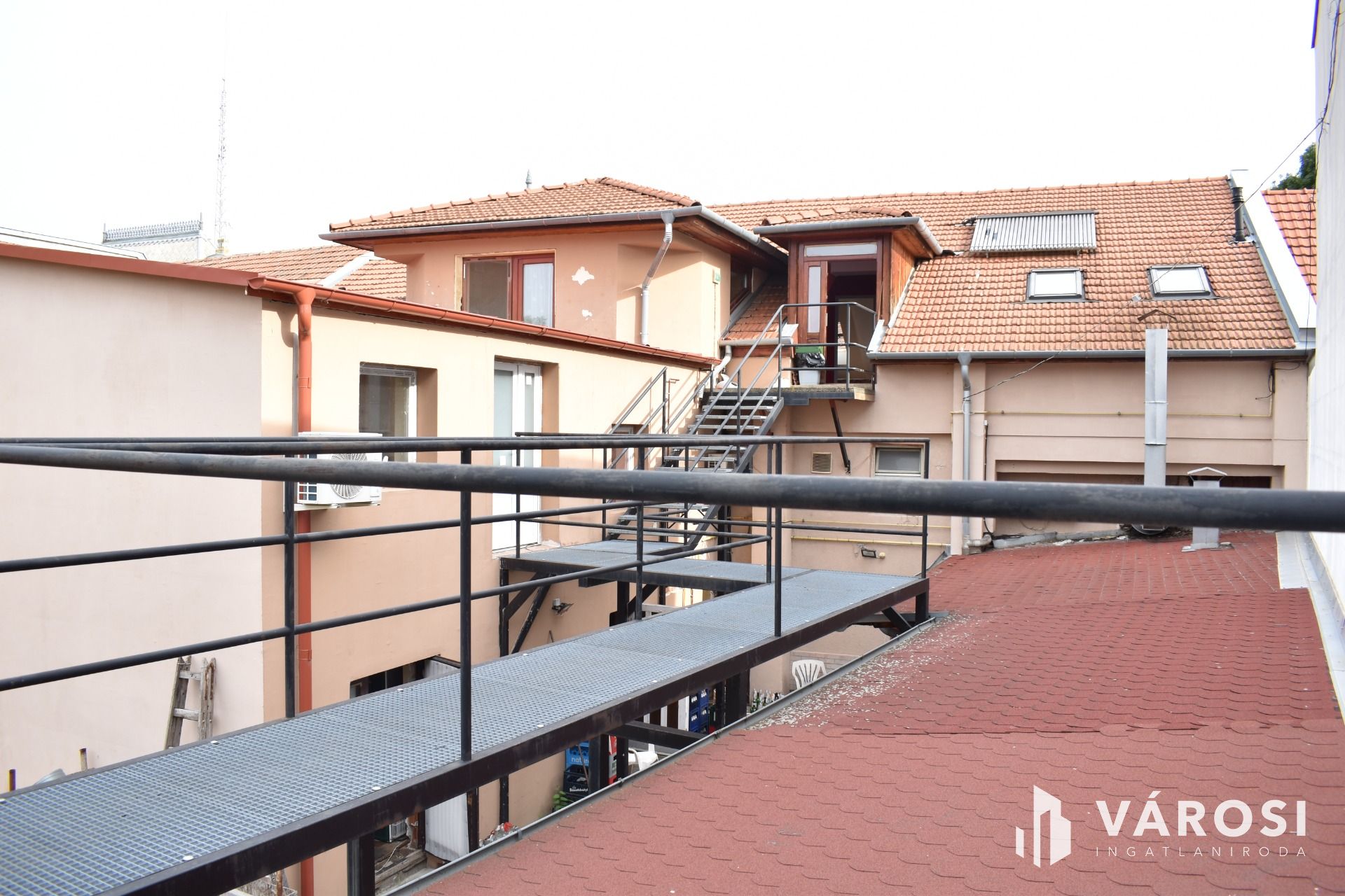 Az épület komplexumnak két bejárata van. Az első bejárat a Kossuth utcára nyílik, ez a főbejárat, illetve a hátsó bejáraton a Pálffy utcáról közelíthetjük meg az udvari részt és egy modern függőfolyosón keresztül az emeleti részen kialakított modern és tágas 5 db. apartmant, melyek szintén modern és újszerű állapotúak és klimatizáltak. Az emeleti részen 32 A lett kialakítva, amely kényelmesen ellátja az apartmanokat.