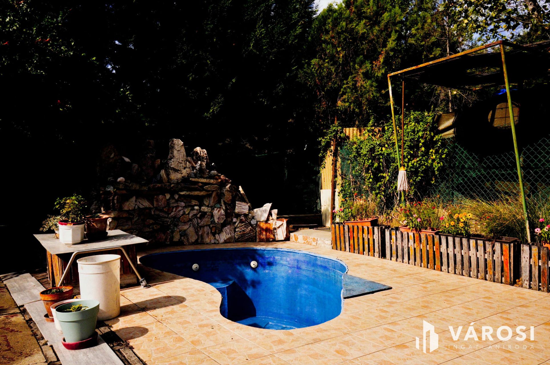A lakóház mögött tarka színekben pompázó virágoskert szegélyezi a kültéri medencét, mely a nyári hőségben felüdülést kínál az ott lakóknak, és melyhez egy egyedi kövekkel, ásványokkal kirakott csodaszép szökőkút is tartozik.