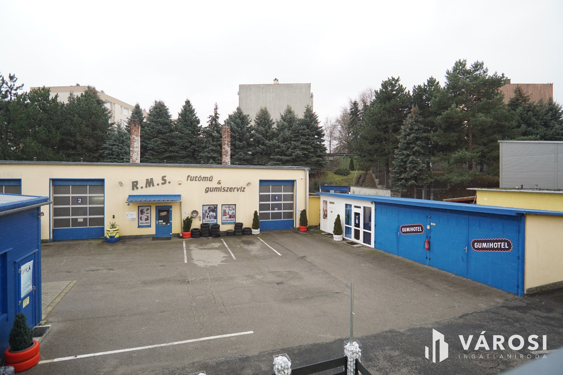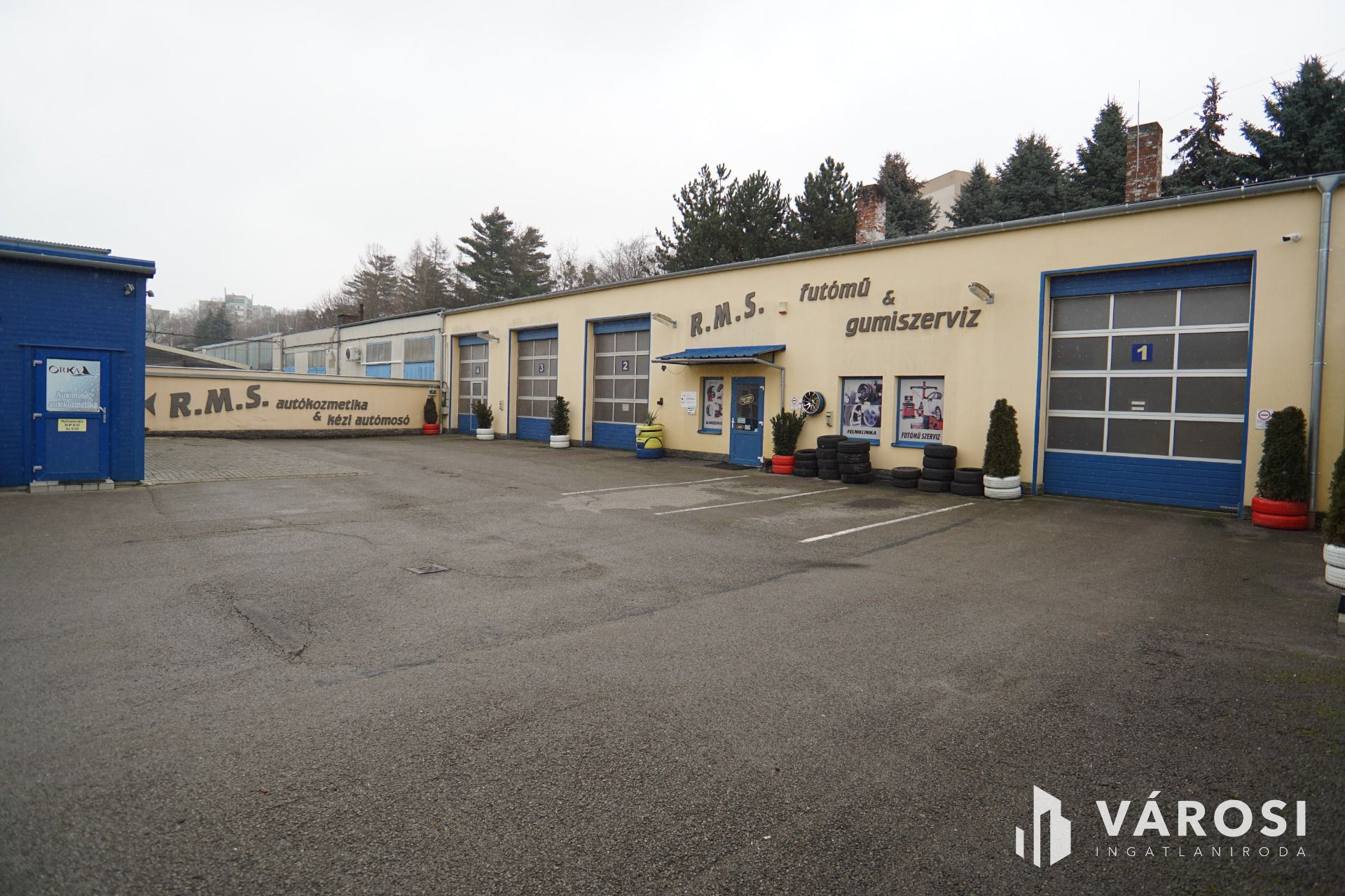Szerviz: 4 külön beállóval rendelkező tégla épület, belső irodával, tárolóval, alkatrészmosóval, galériával valamint forgácsoló-javítórésszel. (Tulajdonos által használva).