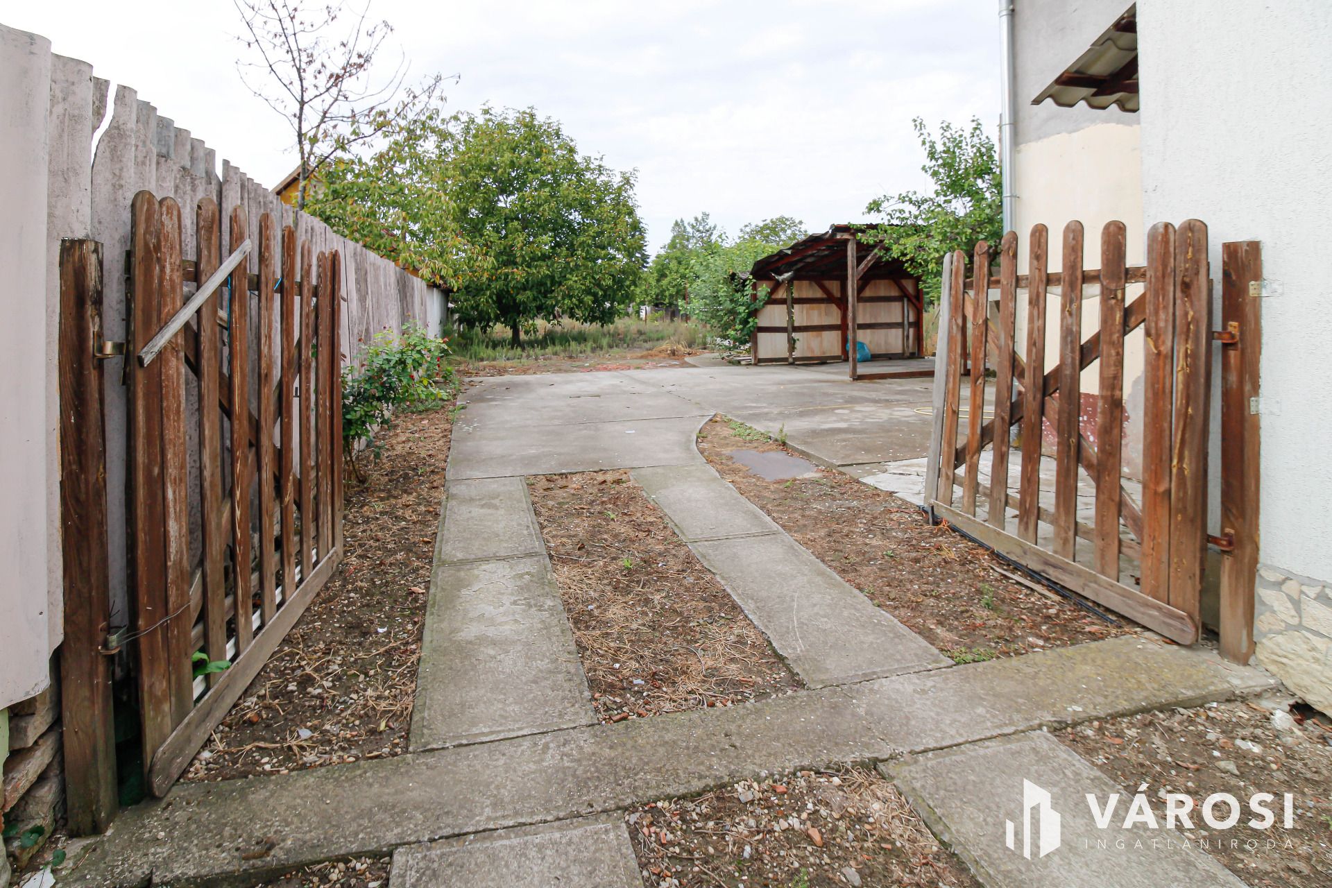 Az udvar rendezett, az előkert dísznövényekkel van telepítve. Fedett garázs és egy tárolóhelyiség található még a területen.