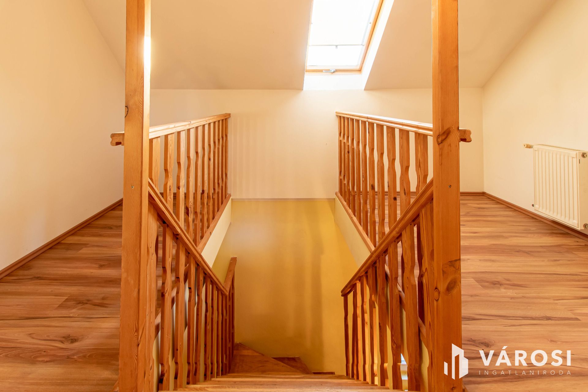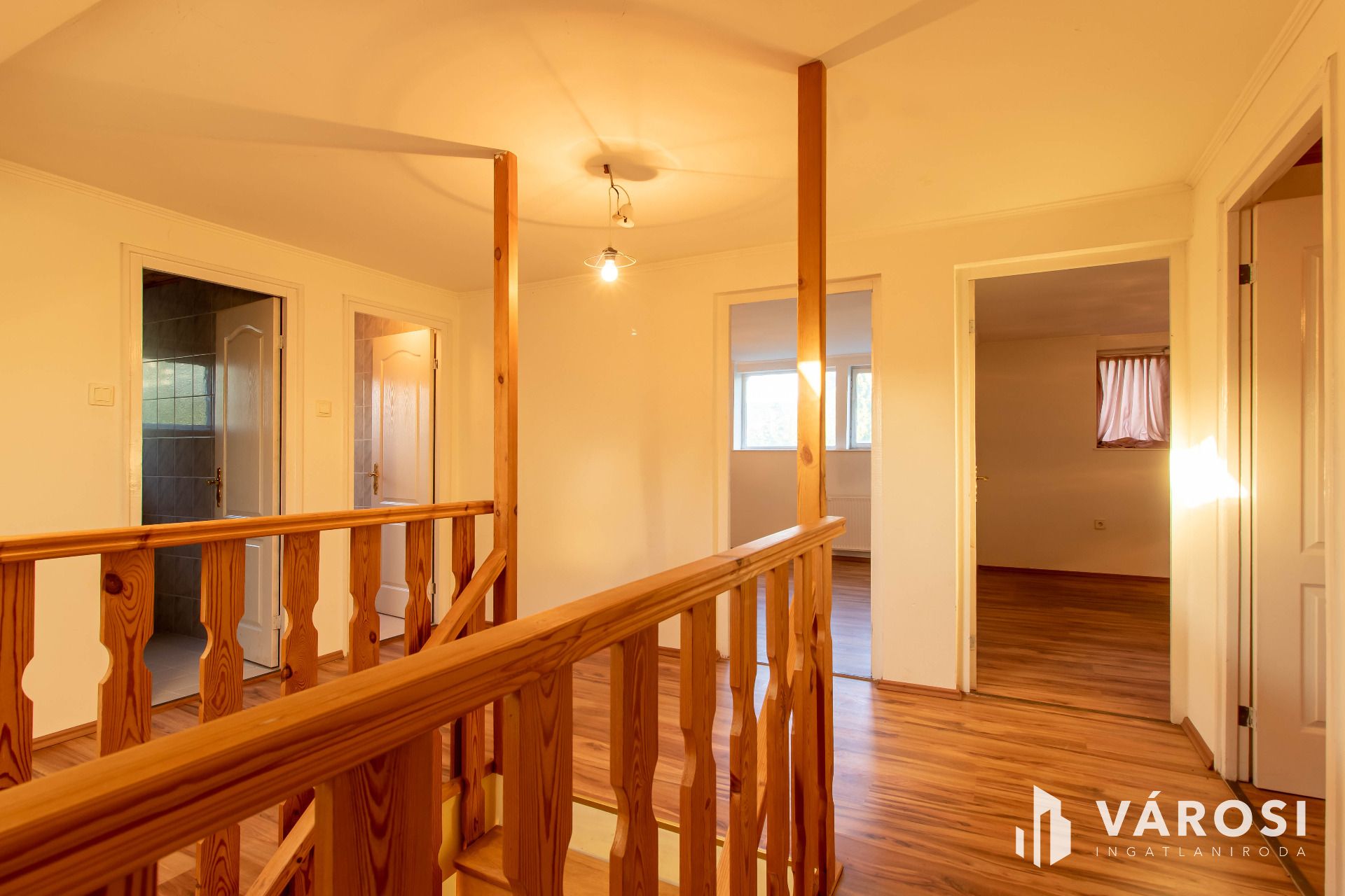 Az emelet szintén rendkívül világos és kényelmes elrendezésű. Itt található egy második fürdőszoba, külön WC, valamint három nagy méretű hálószoba. Kettő közülük teraszkapcsolattal rendelkezik, így a reggeli kávé vagy egy esti beszélgetés a teraszon igazi élményt nyújthat. A szobák laminált burkolata szinte teljesen új állapotban van, hiszen az ingatlan hosszabb ideje üresen állt.
