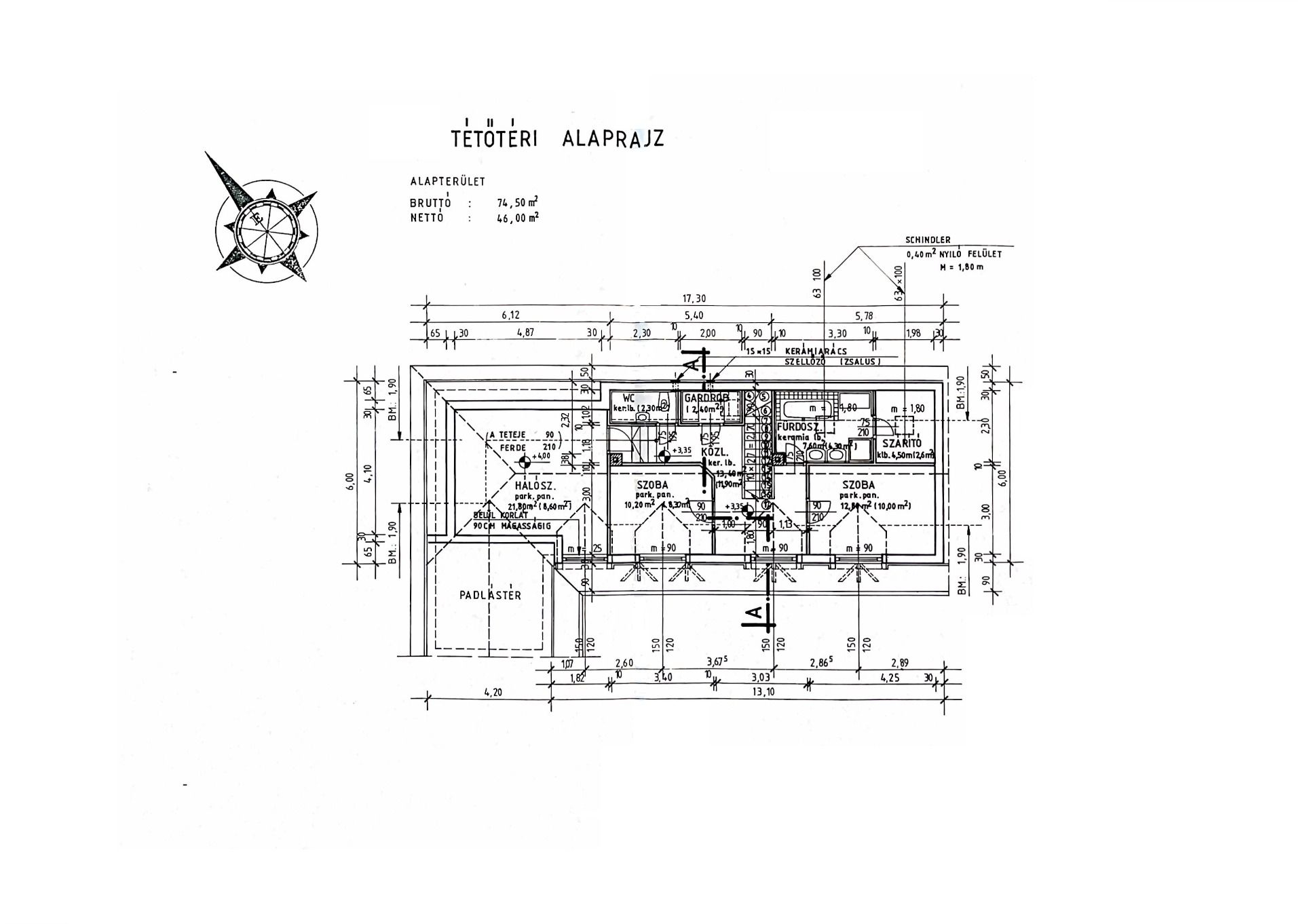 Az épület tetőtere 46 m2 hasznos területű, három hálószoba, egy fürdőszoba, szárítóhelyiség/mosókonyha került kialakításra.