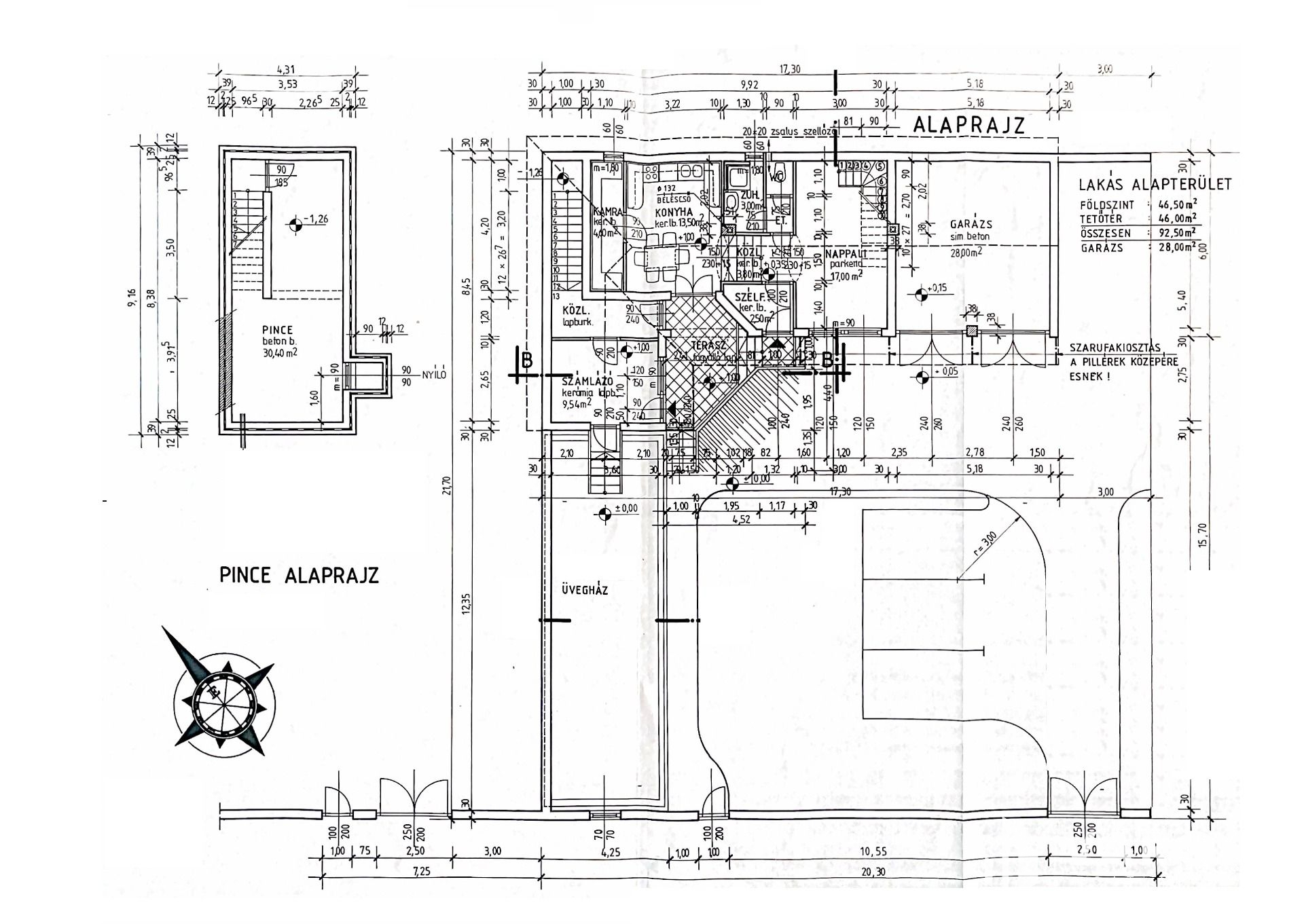 A lakóház földszinti lakótere 46,5 m2, a konyha-étkező helyiséggel egy légterű nappali, illetve WC és zuhanyzó található ezen a szinten, a nappaliból egy vasbeton szerkezetű lépcsőn keresztül juthatunk a tetőtérbe. Ezen kívül a földszinten kialakításra került, egy dupla garázs, amely elektromos, magasított garázskapuval ellátott, így akár magasabb autó, kisteherautó tárolására is alkalmas. Szintén a földszinten található egy 45 m2-es üvegház, ami akár télikertként, vagy pihenő, szabadidős helyiségként, akár wellness helyiségnek is kialakítható, mivel víz és szennyvíz ebben a helyiségben is kiépítésre került.